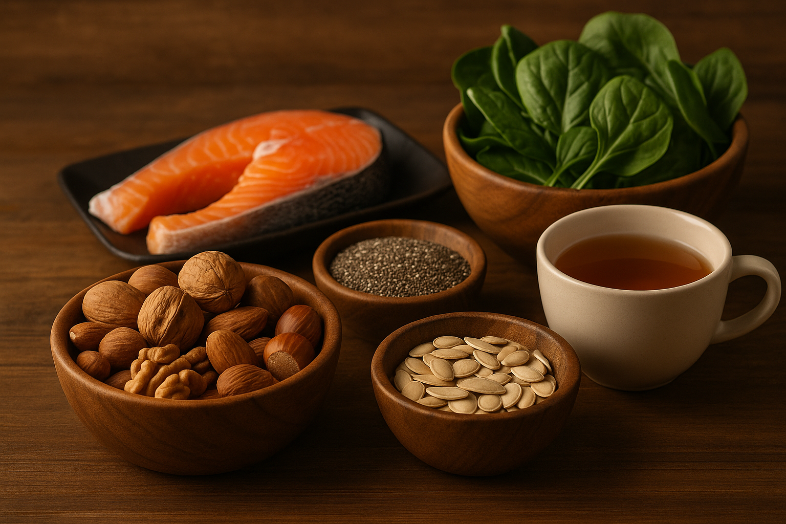 Chrání buňky před oxidačním stresem, podporuje štítnou žlázu i imunitu. Zdroje: para ořechy (stačí 2–3 denně), ryby, vejce, česnek.
